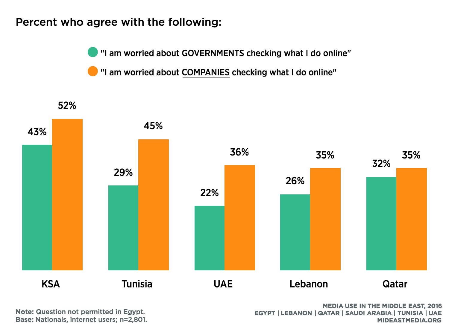 The region is divided on whose responsibility it is to block objectionable content. More nationals in Egypt, Qatar, and Saudi Arabia believe it is the responsibility of governments to block objectionable content, while majorities in the UAE, Lebanon, and Tunisia believe it is the responsibility of the individual to avoid such content. The most evenly divided country is Saudi Arabia, where 50 percent believe responsibility lies with the government and 43 percent believe it lies with the individual. The biggest disparity is in Egypt, where only 30 percent believe it is the responsibility of the individual, compared to 66 percent who believe it is the responsibility of the government to block objectionable content.